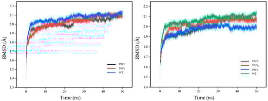 In a previous study, Bathelt et al. analyzed the electronic structure of compound I in the P450 heterodimer using QM/MM simulations that better described the reaction process and helped to further analyze the metabolism of the relevant drug [60]. In this work, GROMACS, a software suitable for simulating macromolecular dynamics, was chosen to evaluate the stability and dynamic properties of the wild-type DoxA and five mutants (DoxA(P69Y), DoxA(P88T), DoxA(V87A), DoxA(V87L), and DoxA(P88Y)) binding with the substrate daunorubicin at the temperature of 300 K. The root-mean-square deviation (RMSD) values were examined during 50 ns of simulation, and the results are shown in Figure 5. At the temperature of 300 K, the RMSD values of almost all proteins reached the equilibrium after 10 ns, and the values were maintained at about 2 Å without significant fluctuations, indicating the fast formation and high stability of protein–substrate complexes. Moreover, compared with the wild-type DoxA, all the mutants had lower RMSD values, which meant that their trajectories were less skewed and the mutation of DoxA promoted the overall structural stability of the protein–substrate complex. The dynamic root-mean-square fluctuation (RMSF) value is also an important indicator of residue flexibility during molecular dynamics simulations. The RMSF values of wild-type DoxA were also compared with those of five mutants (Figure 6). It was shown that the RMSF values of the wild-type DoxA were similar to those of the mutant DoxA(P69Y) and DoxA(P88T), but the values of the β1 fold region (residues 37–53) of both mutants were significantly higher than those of the wild-type DoxA (Figure 6A), which meant that the mutation of P69Y and P88T attenuated the overall rigidity of the β1 region. It might be due to the increased resistance of the spatial site in this region after the mutation, which caused a displacement of the β1 fold structure and led to the weakness of the regional stability and flexibility upon binding to the substrate daunorubicin. Furthermore, the RMSF values of the mutants DoxA(V87A), DoxA(V87L), and DoxA(P88Y) also showed a similar variation trend to those of the wild-type DoxA (Figure 6B). Meanwhile, the RMSF values of these three mutants in the αI helix (residues 262–276) near the α-helix structure-rich region of heme were lower than those of the wild-type DoxA, which demonstrated that the rigidity of the αI helix region was increased. Since the αI helix was the longest α-helix structure running through the center of DoxA, the improvement of its rigidity could promote the stability of the protein and thus enhance the catalytic activity of the enzyme. Based on these results, it was hypothesized that the point mutations in the protein did not affect the stability of the mutated region, but rather the stability of the secondary structures such as α-helix and β-fold, which in turn had a significant impact on the catalytic activity of the enzyme.