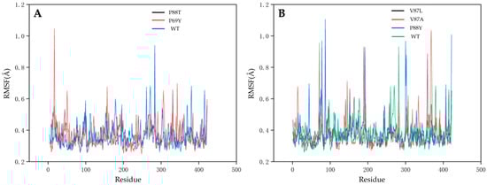 The root-mean-squared fluctuation (RMSF) values of each residue of proteins. (A): P88T and P69Y; (B): V87L, V87A and P88Y.