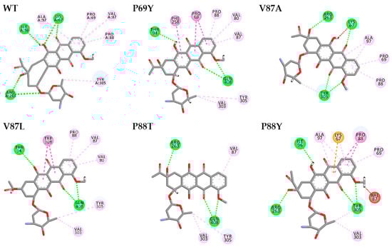 The GOLD program can perform flexible protein–ligand docking to predict the interaction of the substrate with protein and test the quality of protein–ligand complexes [63]. This work was the first to analyze the binding modes of ligands in wild-type DoxA and the mutants using the GOLD program. According to the molecular docking results above, hydrophobic interactions were the main force during the binding of daunorubicin to DoxA. As shown in Figure 7, the GOLD docking results indicate that the first benzene ring remained the primary binding site for the substrate to the enzyme, which meant that the point mutation did not alter the major interaction force between the mutants and the substrate. The mutant DoxA(P88Y) mutating the residue to tyrosine with a phenyl ring resulted in the formation of π–π interactions with the substrate, which suggested that mutating the branch structure of amino acids could cause the formation of new hydrophobic interactions at the binding site and enhance the interaction of the substrate with the protein. It was thus concluded that the point mutation did not affect the hydrophobic interaction of the enzyme with the substrate, and this interaction was further reinforced in the mutant DoxA(P88Y), thereby leading to the increase in enzyme activity.