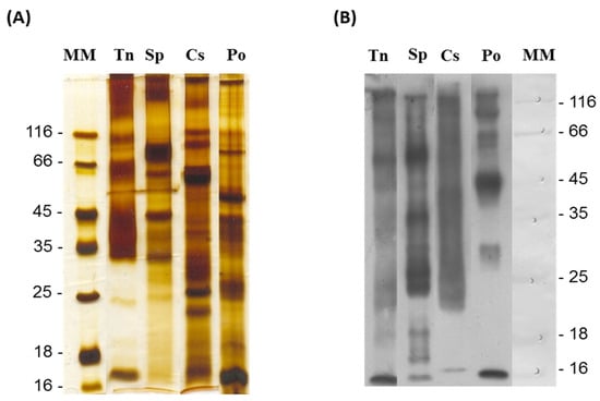 Immunochemical characterization of fish venoms and recognition by polyspecific antiserum. Venoms at 10 μg of Tn (T. nattereri), Sp (S. plumieri), Cs (C. spixii) and Po (Potamotrygon gr. orbignyi) venoms were separated on 4–20% SDS-PAGE gels and stained with silver (A) and revealed by Western blotting with the polyspecific antiserum at 10 μg/mL (B).