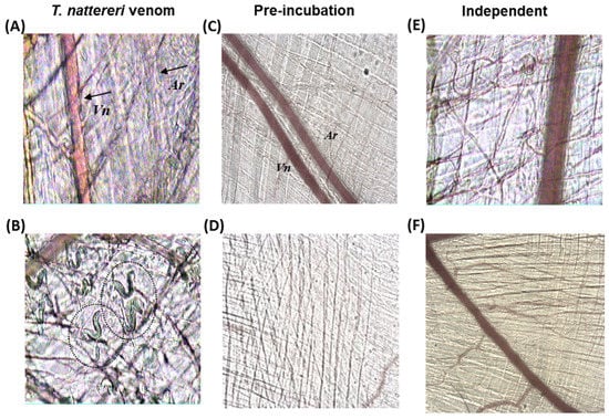 The antiserum neutralized the alterations in the microcirculation induced by T. nattereri venom. The topic application of venom (after 30 min) induced stasis in postcapillary venules (Vn—black arrow at left) and arteriolar constriction (Ar—black arrow at right) (A) and myofibrillar hypercontraction (circle—(B)). The pre-incubation of venom + antiserum (1:1) was able to totally neutralize the effects caused by the venom (C,D). Independent injection of antiserum, immediately (E) or after 15 min (F) of venom application were also efficient. Pictures were photographed 40 min after topical application of the mixture. Images captured with increase of 10×−1.6 optovar.