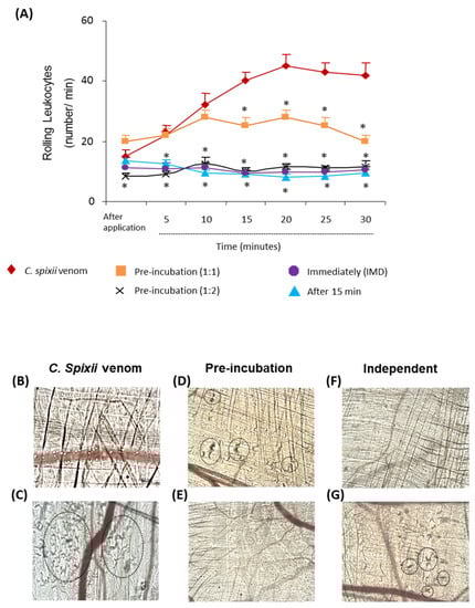 As shown in Figure 4, the C. spixii venom induced an increased number of rolling leukocytes in postcapillary venules (Figure 4A,B) 10 min after its topical application, which remained high for up to 30 min. Next, the neutralizing capacity of the antiserum was evaluated and we observed that the pre-incubation treatment at a ratio of 1:1 reduced the number of rolling leukocytes in the postcapillary venules by—43% after 15 min and remained reduced for up to 30 min. On the contrary, the mixture at a 1:2 ratio in pre-incubation assay or the application of the antiserum immediately or 15 min later completely inhibited the high number of rolling leukocytes induced by the venom (Figure 4A).