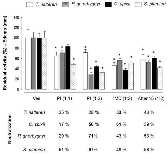 The independent method treatment showed that immediate injection of antiserum at a 1:2 ratio was effective in reducing edema induced by T. nattereri and C. spixii venoms by 53% and 61%, respectively. However, application after 15 min only reduced edema induced by P. gr orbygnyi and S. plumieri venoms by 53% and 58%, respectively. Protection against T. nattereri-venom-induced edema provided by immediate treatment decreased from 53% to 43% when injected after 15 min. The same decrease was seen for C. spixii-venom-induced edema, from 61% to 39%. On the contrary, even when injected after 15 min, the antiserum was able to neutralize the edema induced by the P. gr orbygnyi and S. plumieri venoms.