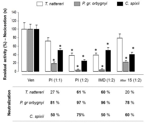 Neutralization of the pain nociception activity induced by T. nattereri, C. spixii, and P. gr orbygnyi venoms by antiserum. Groups of five mice were injected intraplantarly with pre-incubated mixtures of each venom (30 μg/animal) with 30 μg (1:1) or 60 μg (1:2) of antiserum. Mice were treated by i.v. injection of antiserum immediately (IMD) or 15 after the injection of each venom in the paw and nociception was evaluated. * p < 0.05 compared with venom-injected mice. The efficacy of antiserum was reported as the concentration of antibody required to reduce venom-induced toxic activities by 50%.