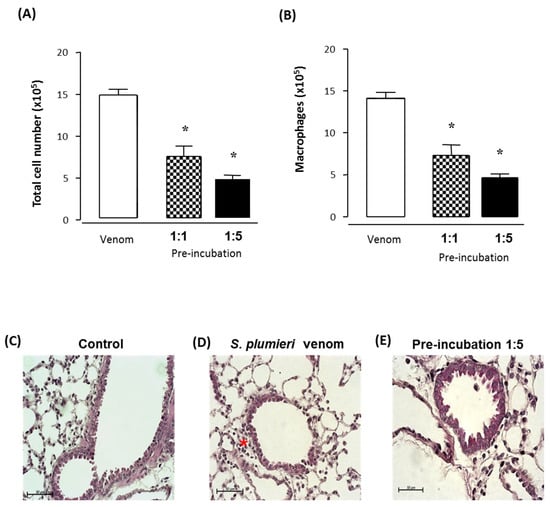 Neutralization of the acute lung injury induced by Scorpaena plumieri venom by antiserum. Groups of mice were intraplantarly injected with 100 μg of S. plumieri venom diluted in 30 μL sterile PBS or pre-incubated mixtures of S. plumieri venom/antiserum at 1:1 or 1:5 ratios. After 24 h, mice were euthanized and BAL was collected for total leukocytes counts (×105, (A)) and characterized mainly for accumulation of macrophages (×105, (B)). H&E staining of lung tissues from venom-injected mice showed peribronchiolar infiltration of mononuclear cells in mice injected with venom (D) compared to control mice that showed no inflammatory infiltrate (C). Panel (E) illustrates the airways of control mice, injected with the venom and those treated with the antiserum. * p < 0.05 compared with venom-injected mice.