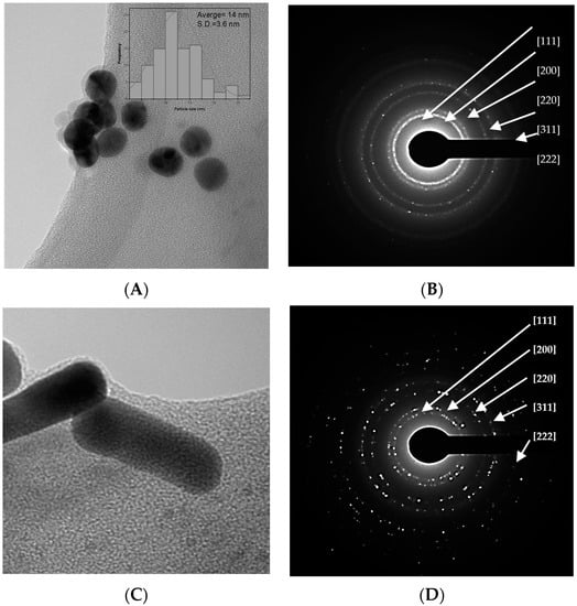 The raw gold colloids are materials obtained from the Turkevich method without any modifications. The sphere-shaped raw colloid has a pH = 6. Figure 1A shows the TEM image of an asphere-shaped colloid with an average particle size of 14 ± 3.6 nm, and Figure 1B depicts their principal diffraction planes related to the XRD pattern of nanoparticles. In Figure 1C, the rod-shaped gold colloid has an average length of 37 ± 6 nm and an average width size of 12 ± 2.8 nm; their corresponding XRD pattern with reflected planes can be seen in Figure 1D.