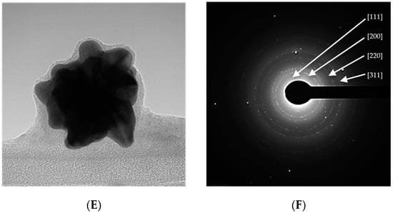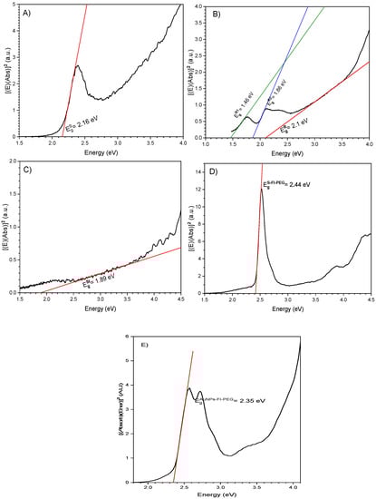 Due to the crystalline nature of a nanoparticle system, we assume that our AuNPs, in the varying shapes obtained, exhibit a direct band gap, so we used the Tauc method to calculate their optical band gap []. Diffuse–reflectance measurements allowed us to calculate nanostructure band gap values (Eg). For spheres, the Eg value was 2.16 , as shown in Figure 4A. In the case of the rod shape, the Eg value was 2.1 , as shown in Figure 4B, and a lower value of 1.89 was registered for the star-shaped AuNPs, see Figure 4C. Eg value of fluorescein is 2.44 , and when spheres were coated with Fi-PEG, their band gap value increased slightly to 2.35 (Figure 4E).