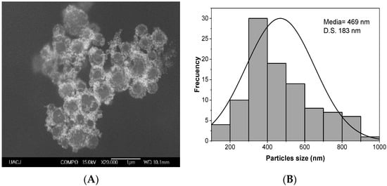 Figure 1E shows a TEM image of a star-like structure with an average particle size of 73 ± 21 nm. The stars have 5 to 8 peaks and different vertex angle peaks. Their electron diffraction pattern is shown in Figure 1F. Finally, the complex of AuNPs with the fluorophore and the polyethylene glycol (Spheres-Fl-PEG) have a particle size of 469 nm ± 183 nm according to SEM images (Figure 2).