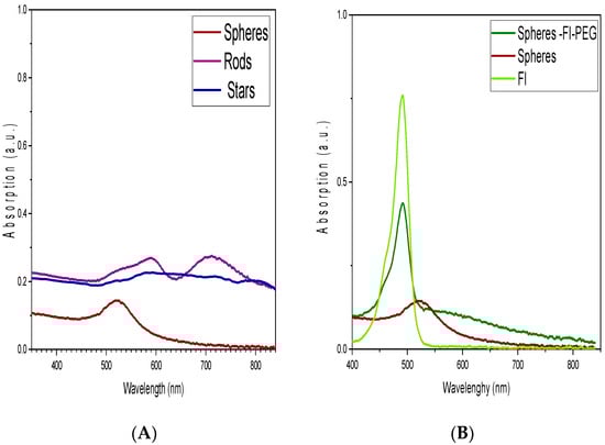 Figure 3 shows the UV-Vis spectrum of gold nanostructures. The sphere-shaped gold colloid presents a broad band with a maximum absorbance of 520 nm. Concerning rod-shaped, two maximum absorbance bands at 590 and 710 nm are visible. In the star-shaped colloid, a slight increase in absorption is noticeable at 492 nm. When the gold spheres are conjugated with a fluorophore (Fl) and polyethylene glycol (PEG), Figure 3B shows a prominent absorption band appearing at 490 nm, and the peak corresponding to gold plasmon decreases. FI band absorption is at 490 nm.