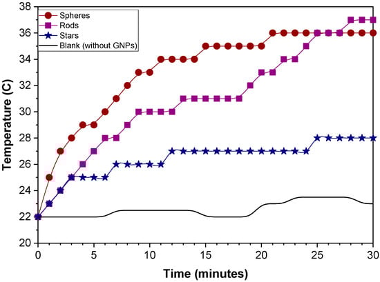 Figure 5 shows the temperature behavior of raw gold colloids in contact with a green laser. During the first 20 min, the sphere-shaped colloid exhibited a higher temperature than the rod-shaped and star-shaped colloids. However, after 25 min, sphere- and rod-shaped particles have the same temperature value. Finally, at 30 min, the rods (37 °C) and spheres (36 °C) reached the highest temperature, while the stars only reached 27 °C. The heat rate of sphere-shaped particles has a higher value of 0.7 °C/min, followed by rod-shaped at 0.44 °C/min and star-shaped particles at 0.36 °C/min.