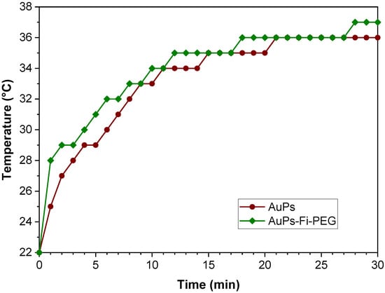 Hyepthermia is one application where optical properties can be used. Gold nanostructures exposed to a laser (532 nm, 300 mW, 30 min) absorb energy, which is transferred to the surrounding medium through plasmonic excitation (light-to-heat conversion). According to D’Acunto (2021), the transformation of light-to-heat of AuNPs takes place in about one ps, so this energy dispersal into the medium is responsible for the temperature increase, and this energy can be used to eliminate a specific body tissue using thermotherapy []. Furthermore, the modulation of this energy is necessary to destroy malignant cells without affecting healthy tissue, as these cells require only half of the energy of healthy cells []. The transferred energy depends on the physiological medium’s shape, size, and composition. The raw star-shaped colloid reaches a maximum temperature of 27 °C in 30 min, which is insufficient to damage the tissue. However, star-shaped and rod-shaped colloids raise a temperature close to 40 °C in 30 min used in hyperthermia treatments []. Spheres have the fastest heating rate due to their greater homogeneity. However, after 30 min, the rod-shaped raw colloid reaches a temperature slightly higher than that of spheres due to its anisotropy, as shown in Figure 5. In the rod-shaped colloid, the plasmonic oscillation occurs in two directions, increasing these from the visible to near IR region. On the other hand, the star-shaped raw colloid reaches the lowest temperature due to its non-homogeneous peaks (peak number and vertex angle). When Fl-PEG adhered to gold spheres, particle size increased from 13.9 nm to 463 nm. The polymer acts as an energy-transfer barrier, slowing the heating rate. However, the temperature reached by the physiological fluid is very similar to the uncoated spheres. In the complex, gold nanoparticles are the photothermal material; the presence of organic molecules does not affect light-to-heat conversion because the gold content is similar.