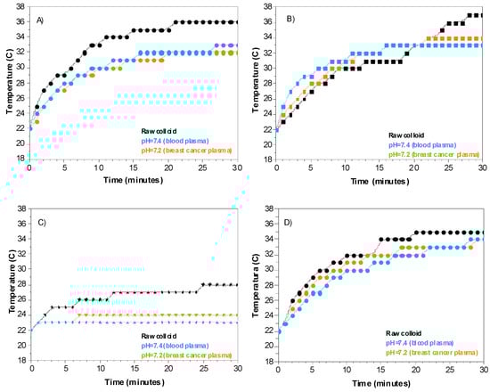 Previous research evaluated the photothermal properties of gold particles, but in biomedical applications, these nanoparticles must be in the form of colloids to achieve greater stability and biocompatibility. Therefore, the colloidal medium can affect the conversion of light to heat. The physiological medium contains varying concentrations of ions/cations, which can alter the stability and, consequently, the conversion of light to heat. The challenge of the AuNPs colloidal is to adapt to the phycological environments. For example, unlike cancerous tissue, healthy tissue manifests different blood flow, oxygen supply, nutrients, and pH []. As a result, the conversion and transfer of energy resulting from the plasmon resonance of gold nanoparticles can be affected by the different physiological conditions present in the body.