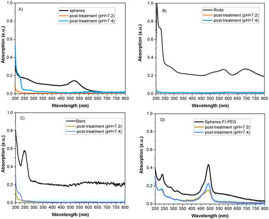 Thomas and Col. (2018) define photodegradation as nanostructure changes due to heat generated by laser irradiation []. Therefore, the optical properties of colloids were assessed after exposure to radiation and a physiological medium. Colloidal post-treatment is shown in Figure 8. The absorbance band of spheres, rods, and stars exhibits extremely low intensity, almost disappearing (Figure 8A–C). When spheres were coated with Fi-PEG (Figure 8D), absorbance intensity decreased less than it did for uncoated spheres (Figure 8A).