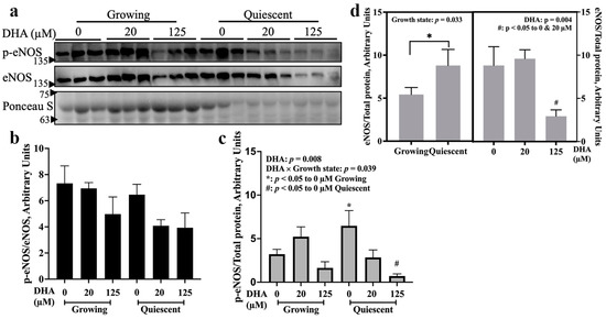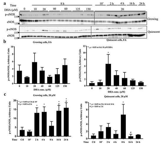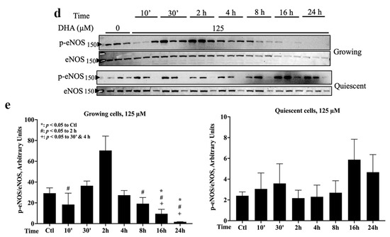 2.1. eNOS Was Activated by 20 µM DHA in Both Growth States, but 125 µM DHA Decreased eNOS Activation in Growing Cells