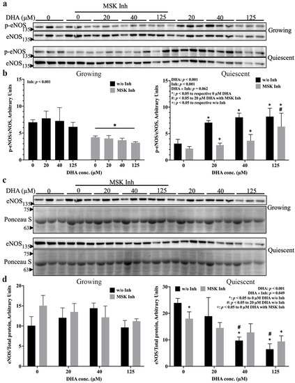 In growing cells (Figure 4b left), p-eNOS levels were reduced by MSK inhibition independent of DHA treatment. On the other hand, in quiescent cells (Figure 4b right), eNOS was activated by all 3 concentrations of DHA, while MSK inhibition suppressed this activation for the 20 and 40 µM DHA treatments. At the higher DHA concentration (125 µM), however, eNOS remained activated in quiescent cells compared to 0 and 20 µM DHA plus MSK inhibitor treatment. Therefore, eNOS activation is dependent upon MSK in both growth states, with or without DHA, except in quiescent cells exposed to a high concentration (125 µM) of DHA. Based on these results, it is obvious that the response of eNOS activation to p38 MAPK inhibition (Figure 3b,d) and MSK inhibition (Figure 4b) in conjunction with DHA treatment was not the same. Therefore, these two kinases operate independently when signalling to eNOS in response to DHA.