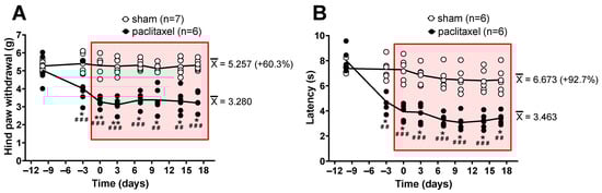 Paclitaxel 2 mg/kg i.p. (6 mice) or vehicle (6 mice) was administered as i.p. injections for 5 consecutive days, starting from day −10. (A) Time course of the allodynic effect induced by paclitaxel, as revealed by reduction in the hindlimb withdrawal threshold (in g) upon electronic von Frey testing. Intragroup statistics: * p < 0.05, ** p < 0.01, repeated measures two-way ANOVA, Ftime (3.316, 36.48) = 6.697, compared scores after paclitaxel against pre-injection basal scores at day −10. Intergroup statistics: ## p < 0.01, ### p < 0.001, repeated measures two-way ANOVA, Ftreatment F (1, 10) = 172.4, compared scores after paclitaxel against corresponding scores obtained in sham mice. (B) Time course of the hyperalgesic effect induced by paclitaxel, as revealed by reduction in the response latency (in s) upon hot plate testing. Intragroup statistics: * p < 0.05, repeated measures two-way ANOVA, Ftime (4.076, 40.76) = 46.77, compared scores after paclitaxel against pre-injection basal scores at day −10. Intergroup statistics: ## p < 0.01, ### p < 0.001, repeated measures two-way ANOVA, Ftreatment (1, 10) = 62.33, compared scores after paclitaxel against corresponding scores obtained in sham mice. In (A,B), the mean of scores of sham and paclitaxel-treated mice between day 0 and day 17 (inside the red square) are shown at the right side of the figure (in parentheses is shown how much higher, in percentage, is the mean of scores in sham versus paclitaxel-treated mice).
