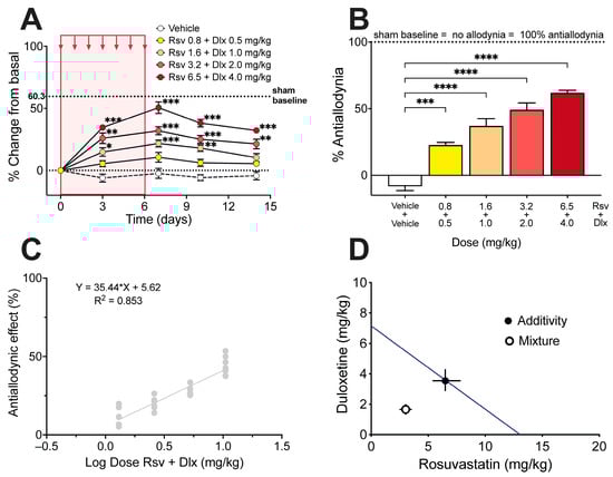 Effect of rosuvastatin/duloxetine combination on mechanical allodynia induced by paclitaxel in mice, and isobologram of the interaction. (A) Time course of the antiallodynic effect of vehicle and rosuvastatin (Rsv)/duloxetine (Dlx) combination administered in fixed ratios of their respective ED30, expressed as % change of electronic von Frey scores (in g) regarding basal score at day 0 (i.e., 10 days after starting paclitaxel administration). Intragroup statistics: * p < 0.05, ** p < 0.01, *** p < 0.001, two-way ANOVA, Ftime (3.293, 92.21) = 72.97. (B) % Antiallodynia after vehicle and rosuvastatin/duloxetine combination, calculated from area under curves of (A), considering 100% antiallodynia (i.e., no allodynia) the sham control baseline (taken from Figure 1A). Statistics: *** p < 0.001, **** p < 0.0001, one-way ANOVA, F (4, 22) = 30.22. (C) Dose-response data representing the antiallodynic effect (in %) of rosuvastatin (Rsv)/duloxetine (Dlx) combination, expressed as dose logarithm. The equation for linear regression and the goodness of fit (R2) is shown in the graph. The ED30 of rosuvastatin/duloxetine combination was calculated from the regression line. (D) Isobologram of interaction for the antiallodynic effect of the rosuvastatin/duloxetine combination in mice with paclitaxel-induced neuropathy. The black circle on the straight line represents the point of theoretical additivity of the combination, whereas the white circle corresponds to the experimental point. The experimental point was significantly different from the theoretical point (mean ± SEM, p < 0.001), with an interaction index γ = 0.466, indicating superadditive interaction. The standard errors for rosuvastatin and duloxetine are resolved into rosuvastatin (abscissa scale) and duloxetine (ordinate scale) components and shown by horizontal and vertical bars, respectively.
