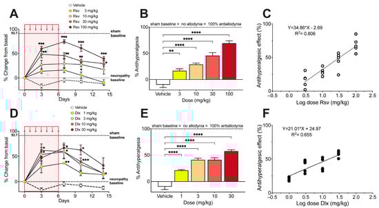 Effect of rosuvastatin and duloxetine on mechanical allodynia induced by paclitaxel in mice. (A) Time course of the antiallodynic effect of 7 injection (red area) of vehicle and 3, 10, 30, and 100 mg/kg i.p. rosuvastatin (Rsv), expressed as % change of electronic von Frey scores (in g) regarding basal score at day 0 (i.e., 10 days after starting paclitaxel administration). Intragroup statistics: * p < 0.05, ** p < 0.01, *** p < 0.001, two-way ANOVA, Ftime (3.423, 82.14) = 44.86. (B) % Antiallodynia after vehicle and 3, 10, 30, and 100 mg/kg i.p. rosuvastatin, calculated from area under curves of (A), considering 100% antiallodynia (i.e., no allodynia) the sham control baseline (taken from Figure 1A). Statistics: **** p < 0.0001, one-way ANOVA, F (4, 22) = 68.36. (C) Dose-response data representing the antiallodynic effect (in %) of rosuvastatin (Rsv), expressed as dose logarithm. The equation for linear regression and the goodness of fit (R2) is shown in the graph. The ED30 of rosuvastatin was calculated from the regression line. (D) Time course of the antiallodynic effect of vehicle and 1, 3, 10, and 30 mg/kg i.p. duloxetine, expressed as % change of electronic von Frey scores (in g) regarding basal score at day 0 (i.e., 10 days after starting paclitaxel administration). Intragroup statistics: * p < 0.05, ** p < 0.01, *** p < 0.001, two-way ANOVA, Ftime (2.963, 65.18) = 25.31. (E) % Antiallodynia after vehicle and 1, 3, 10, and 30 mg/kg i.p. duloxetine, calculated from area under curves of (D), considering 100% antiallodynia (i.e., no allodynia) the sham control baseline (taken from Figure 1A). Statistics: * p < 0.05, *** p < 0.001, **** p < 0.0001, one-way ANOVA, F (4, 22) = 32.92. (F) Dose-response data representing the antiallodynic effect (in %) of duloxetine (Dlx), expressed as dose logarithm. The equation for linear regression and the goodness of fit (R2) is shown in the graph. The ED30 of duloxetine was calculated from the regression line. In (A,B,D,E), values are means ± SEM. In all panels n = 6 mice per group.