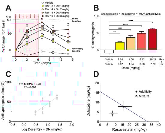 The antinociceptive effects of rosuvastatin and duloxetine (as well as the effects of the respective vehicles) in mice with paclitaxel-induced neuropathy were evaluated using the hot plate and the electronic von Frey tests. All algesimetric evaluations took place at noon, immediately before rosuvastatin, duloxetine, or vehicle administration. Dose-response curves were carried out using daily administration of rosuvastatin (3, 10, 30, 100 mg/kg i.p.) or duloxetine (1, 3, 10, 30 mg/kg i.p.) during 7 consecutive days, starting 10 days after the first administration of paclitaxel once stable levels of allodynia and hyperalgesia were observed. Dose ranges for rosuvastatin and duloxetine were taken from Miranda et al. [] and from Bomholt et al. [], respectively. Mice were evaluated on days 3, 7, 10, and 14, with day 0 being the day that rosuvastatin or duloxetine treatment (or vehicle control) was initiated. To construct time-course curves, values were expressed as % variation of scores after drug or vehicle (as compared to pre-drug/pre-vehicle scores) and plotted against time. To assess the global antinociceptive effect of the drugs, the areas under the curves were calculated using GraphPad Prism 9.0 software (GraphPad Software, Inc., San Diego, CA, USA), covering a period of time between the first day of injection of antinociceptive drug (day 0) and the last day of evaluation of the effects (day 14). The % reduction in area under curves, termed % Antiallodynia in the case of von Frey testing and % Antihyperalgesia in the case of hot plate testing, was calculated according to the equation 100 − [(A/B) × 100], where A is the area under the curve of a drug-treated animal and B is the mean area under the curve of the respective control sham group []. Plotting the % Antiallodynia and % Antihyperalgesia values against log dose allowed for obtaining the EDX (i.e., the effective dose that produce X% of the maximal antiallodynic or antihyperalgesic effect) by linear regression analysis, the maximal antiallodynic or antihyperalgesic effect being the 100% Antiallodynia/Antihyperalgesia level (i.e., no allodynia/hyperalgesia) shown by the respective control group of sham mice. In the present study, the ED50 was used to assess the antihyperalgesic effect of rosuvastatin, duloxetine, or their combination on the hot plate test, while the ED30 was used to assess the effect of rosuvastatin, duloxetine, or their combination on mechanical allodynia, since the low sensitivity of the von Frey test against duloxetine and its combination with rosuvastatin did not allow reaching 50% antiallodynia, even with the highest doses used with these drugs. As reported elsewhere by Tallarida [], concerning isobolographic analysis of drug interaction, the measured effect is very often 50% of the maximum (i.e., ED50), although any other level of effect reached by the drugs to be combined can be used. For example, Pelissier et al. [] used ED25 when the algesimetric test was not very sensitive to a particular drug, either alone or in combination.
