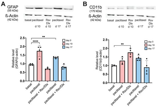Expression levels of GFAP and CD11b proteins, assessed by Western blot, from dorsal horn tissue of mice with paclitaxel-induced neuropathy, and the effect of treatment with rosuvastatin/duloxetine combination. Paclitaxel 2 mg/kg was administered as i.p. injections for 5 consecutive days; 10 days after the first injection of paclitaxel, a 7-day antinociceptive treatment with rosuvastatin/duloxetine combination (at the ED50 dose calculated upon von Frey testing, containing 9.40 mg/kg rosuvastatin plus 7.23 mg/kg duloxetine, started at day 0. Mice with paclitaxel-induced neuropathy that did not receive the rosuvastatin/duloxetine combination served as controls. (A) Upper panel: Basal (day 0) and post-paclitaxel (days 10 and 17) blots of GFAP and β-actin in mice treated and non-treated with rosuvastatin/duloxetine (Rsv/Dulo) combination. Lower panel: The graph illustrates density data obtained from four blots after normalization to β-actin, expressed as fold-change relative to basal data (set as 1). GFAP expression was increased in paclitaxel-injected mice at day 10 (**** p < 0.0001) and day 17 (** p < 0.01) relative to basal score at day 0 (one-way ANOVA, F (4, 15) = 27.83). However, paclitaxel-injected mice treated with the rosuvastatin/duloxetine (Rsv/Dulo) combination did not show any statistical difference at day 10 and day 17 relative to basal score at day 0. (B) Upper panel: Basal (day 0) and post-paclitaxel (days 10 and 17) blots of CD11b and β-actin in mice treated and non-treated with rosuvastatin/duloxetine (Rsv/Dulo) combination. Lower panel: The graph illustrates density data obtained from four blots after normalization to β-actin, expressed as fold-change relative to basal data (set as 1). CD11b expression was not modified at day 10 or day 17 in paclitaxel-injected mice relative to basal score at day 0. However, the rosuvastatin/duloxetine (Rsv/Dulo) combination significantly increased (** p < 0.01) CD11b expression in paclitaxel-injected mice at day 10 (but not on day 17) relative to basal score at day 0 (one-way ANOVA, F (4, 15) = 8.831).