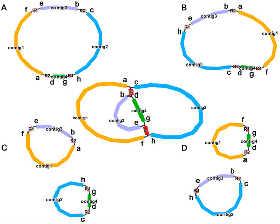Potential isomers of P. aculeata mitogenome inferred from PCR experiments and long reads. The initial assembly is shown in the middle of the figure, with (A–D) representing the four possible isomers formed after solving the paths of the two pairs of repeating regions (R1 and R2). We use lowercase letters (a–h) to mark breakpoints at several nodes to describe several paths, where (e,f) stands for p1, (g,h) stands for p2, (e–h) stands for p3, (f,g) stands for p4, (a,b) stands for p5, (c,d) stands for p6, (a–d) stands for p7 and (b,c) stands for p8. These isomers contain two ‘master circle’ structures (A,B), which differ in sequence order, and two structures of two separate small circles (C,D). In this study, we use the structure shown in panel (A) for the downstream analysis, which is supported by most long reads.