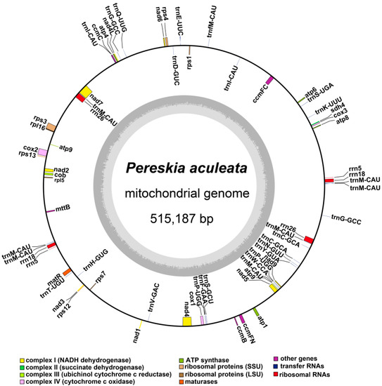In this study, we report the complete mitogenome of P. aculeata. The genome length is 515,187 bp and its GC content is 44.05%. Long reads and PCR confirmed that there are two repetitive sequences in the P. aculeata mitogenome that promote the rearrangement of the mitogenomes and generate multiple isomers. The mitogenome of P. aculeata was studied in detail from many aspects, which provided important genetic resources for the phylogenetic study of P. aculeata and laid a foundation for the mitogenome study of the Cactaceae family.