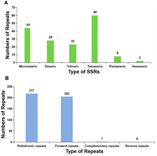 The simple sequence repeats (SSRs) were obtained via the online website MISA (https://webblast.ipk-gatersleben.de/misa/; accessed on 12 January 2023) [85]; the parameters of the minimum numbers of mono-, di-, tri-, tetra-, penta-, and hexanucleotides were set as 10, 5, 4, 3, 3, and 3, respectively. In addition, we used REPuter (https://bibiserv.cebitec.uni-bielefeld.de/reputer/; accessed on 12 January 2023) [86] to calculate forward, reverse, palindromic, and complementary repeat sequences, with the following settings: hamming distance of three and minimal repeat size of 30 bp, and e-value was limited to less than 1 × 10−5. The visualization of the repeat elements was accomplished by using the Circos [87] package.