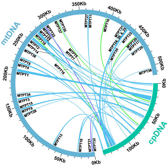 Schematic representation of homologous sequences between chloroplast genome and mitogenomes in P. aculeata. The blue arcs represent mitogenomes, the green arcs represent chloroplast genomes, and the lines between arcs correspond to homologous genome segments. A total of 38 MTPTs were identified, and their numbers are given in the figure. Among them, lines with a percentage of sequence similarity above 90 are blue, those between 80 and 90 are green, and those less than 80 are purple. A total of 17 complete genes migrated to the mitogenome, including 8 PCGs and 9 tRNA genes. These complete genes were labeled next to the corresponding MTPT. Some homologous sequences are in the IR region of the plastome. We count them according to unique locations on the mitogenome.