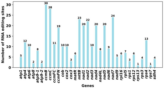 Based on Deepred-mt, the RNA editing events of 33 PCGs from mitogenome were identified. The 25 species on the page were selected as the database. Using this criterion, 362 potential RNA editing sites were identified (Figure 7 and Table S9). There are great differences in the number of sites edited by different genes. Among mitochondrial genes, the ccmB gene identified 30 RNA editing sites, the most among all genes. This was followed by ccmC, with 28. However, the rps13 and rps7 genes only identified one RNA editing site.