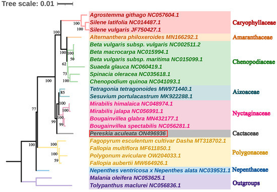 To investigate the phylogenetic position of P. aculeata, we downloaded mitogenome sequences of 24 species from GenBank, including 21 closely related species and two outgroups. The phylogenetic tree (Figure 8) showed that Caryophyllaceae, Amaranthaceae, and Chenopodiaceae were clustered into one clade, and Aizoaceae, Nyctaginaceae, and Cactaceae were clustered into another clade. Polygonaceae and Nepenthaceae each form a separate clade. The phylogenetic tree is consistent with the Angiosperm Phylogeny Group IV (APG IV) classification system; that is, P. aculeata belongs to the Cactaceae family of Caryophyllales, which is closely related to Aizoaceae and Nyctaginaceae. Most of the nodes of the phylogenetic tree in this study had relatively high bootstrap values, indicating that the phylogenetic analysis had high reliability.