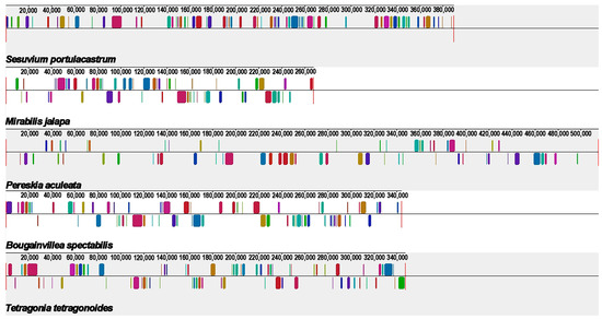 Synteny analysis deals with the arrangement of homologous genes or sequences. Based on Mauve (version 20150226) software [46], we performed synteny analysis on the mitogenomes of P. aculeata and four related species (Tetragonia tetragonoides, Mirabilis jalapa, Sesuvium portulacastrum, and Bougainvillea spectabilis) (Table S10). These species exhibit many common colinear mitogenomic sequences. However, these collinear sequences have an irregular arrangement, showing a rearrangement of the mitogenome. These results also indicate that the conformation of mitogenome is extremely non-conserved. As shown in Figure 9, there are only 86 shared collinear blocks among these five mitogenomes, with lengths ranging from 115 bp to 3780 bp. In contrast, a large number of regions (mainly non-coding regions) show high species-specific levels.