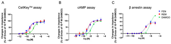 Figure 1A depicts the concentration-response curves obtained using the CellKeyTM assay for the activities of MOR in cells stably expressing MOR treated with varying concentrations of REM, FEN, and DAMGO. REM and FEN increased cellular impedance in a concentration-dependent manner, with their EC50 and Emax having almost similar values. Similarly, in the cAMP and β arrestin assay, REM and FEN exhibited similar potency and efficacy (Figure 1B,C).