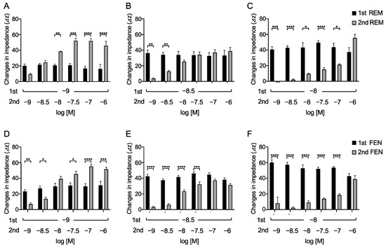 Overall analyses to find concentrations of secondary-administered REM or FEN to achieve responses equal to the 1st responses in cells expressing MOR with the CellKeyTM. Cells expressing MOR were treated with varying concentrations of REM or FEN (10−9 to 10−6 M). After measuring changes in impedance (ΔZiec) by the 1st administration (10−9, 3 × 10−9, and 10−8 M) of analgesics, 2nd administration (10−9 to 10−6 M) was conducted, and changes in impedance were measured (ΔZiec) in cells. The 1st administration of REM at 10−9 M (A), 3 × 10−9 M (B), or 10−8 M (C) and the 1st administration of FEN at 10−9 M (D), 3 × 10−9 M (E), or 10−8 M (F) are independently depicted. * p < 0.05, ** p < 0.01, *** p < 0.001, **** p < 0.0001 vs. the 1st responses by FEN or REM.