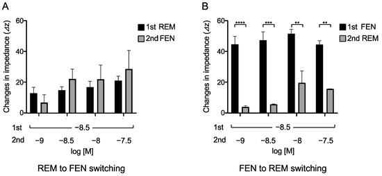 Opioid switching from REM to FEN and FEN to REM in cells expressing MOR assessed with CellKeyTM. Cells expressing MOR were treated with REM or FEN at specific concentrations. In the protocol, analgesics of the 2nd administration were changed from REM to FEN (A) or FEN to REM (B), and the changes in impedance (ΔZiec) were measured. Data are presented as mean ± SEM for three independent experiments (n = 6). ** p < 0.01, *** p < 0.001, **** p < 0.0001 vs. 1st responses by REM or FEN.