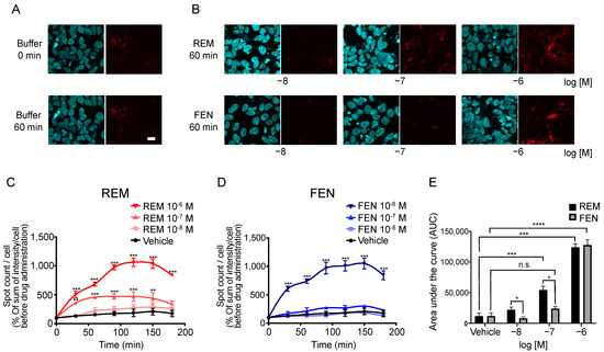 MOR internalization assay was performed according to a previously described method [16,25]. Briefly, cells stably expressing Halotag®MOR/pGS22F (1.2 × 105 cells/well) were seeded in a polyethylenimine-coated 8-well chamber slide system. After incubation for 24 h, the cells were washed once with the internalization buffer (10 mM HEPES, 140 mM NaCl, 5 mM KCl, 2 mM CaCl2, 1 mM MgCl2, and 10 D-glucose at pH 7.4) and stained with Hoechst 33342 for 10 min followed by the pH sensor ligand (0.5 × 10−6 M) for 15 min (incubated in 5% CO2 at 37 °C). Red spots in the cells were recorded every 30 min after compound treatment for 180 min, using an FV10i confocal laser scanning microscope (Olympus, Tokyo, Japan). Both REM and FEN were administered immediately before the start of observation. The numbers of both red spots and nuclei were counted using MetaMorph® 7.7 (Molecular Devices, San Jose, CA, USA). Data were quantified as “sum of intensity/cell” and normalized to that of cells before compound administration (% of the sum of intensity/cell before compound administration).