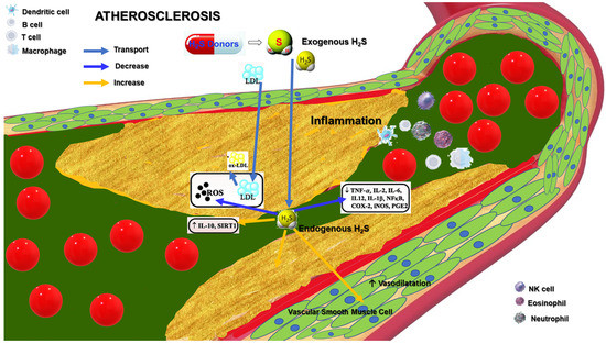 Recent analyses have revealed that the synthesis of H2S is progressively decreased during the development of atherosclerosis in fat-fed apoE2/2 mice, which may indicate the potential use of H2S donor drugs in treating atherosclerosis. Experiments with NaHS, an H2S donor, and a CSE inhibitor support this claim by showing that exogenous H2S supplementation can prevent or reduce plaque formation and that endogenous H2S depletion can aggravate atherosclerotic lesions. Additionally, H2S has been found to regulate the expression of chemokines and their receptors, particularly CX3CL1–CX3CR1, in stimulated macrophages [85].