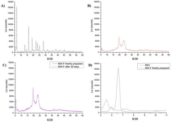 X-ray diffractograms of (A) pure RSV (black line); (B) MIX-BL (red line); (C) MIX-F immediately after preparation (blue line) and after 30 days storage (purple line); (D) Magnification of pure RSV and fresh MIX-F diffractograms to better highlight the most representative RSV peak at 6.6 θ.