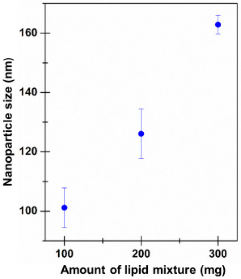 LNP particle size values versus the amount of MIX-F used for LNPs preparation. Mean ± SE (n = 9).