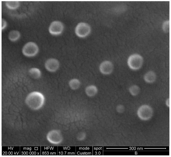 To evaluate the morphology of the chosen LNPs, SEM analyses were further carried out. As a result, spherical, homogeneous and nanometric particles were observed (Figure 3). Moreover, the diameter of the LNPs resulted slightly smaller than that resulting from DLS measurements (≈100 nm vs. ≈160 nm, respectively).