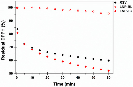 Residual DPPH (%) as a function of incubation time when evaluating the LNP-BL (red—open symbol), LNP-F3 (red—solid symbol) and RSV solution (black—solid symbol). Means ± SE (n = 3).