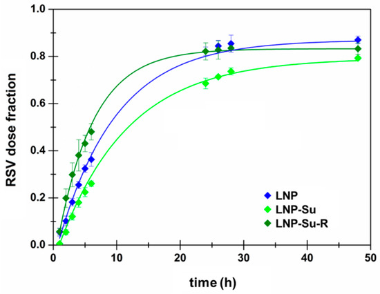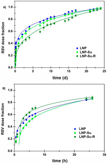 The results were expressed as RSV dose fraction released from the LNPs as a function of time (the graphical presentation of the data is reported below, together with the kinetic evaluations and the best curve fitting).