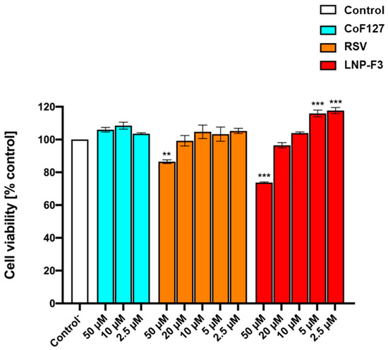 Cell viability assay on BALB/3-T3 cells. Cells were treated for 24 h in the absence (control) or presence of either citrate buffer pH 5.5 plus Pluronic F-127 (Co F127), RSV or LNP-F3 dispersions at different concentrations (from 2.5 to 50 µM). Values are means ± SD of three separate experiments conducted in triplicate (n = 9). With respect to control, ** p < 0.01; *** p < 0.001 (ANOVA associated with Tukey’s test). The Co F127 sample was evaluated at the same dilution as the LNP-F3 samples needed to achieve 2.5, 10 and 50 μM of RSV.