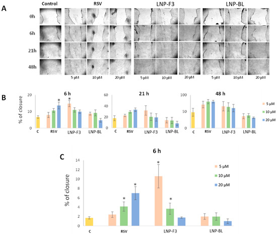 Further biological studies were conducted as a proof of concept of the potentiality of RSV-loaded LNPs for wound healing purpose. The wound healing properties of LNP-F3 were evaluated in terms of normal fibroblast migration by the scratch assay. Cells were treated with increasing concentration of RSV as well as freshly prepared LNP-F3 dispersion, equal in terms of RSV amount (5, 10 and 20 µM). Additionally, the RSV-free LNPs (LNP-BL) were evaluated to verify any vehicle property. Two different sets of experiments were then carried out by treating cells in the presence (Figure 8A,B) or absence (Figure 8C) of FBS. The FBS variable was studies because the latter stimulates cell proliferation (especially for longer time points), thus specifically impairing the ability of evaluating cell migration. The obtained data fully confirm this statement. Indeed, in the presence of FBS, cell migration was monitored at 6, 21 and 48 h. As can be seen (Figure 8), the best performance was recorded after 6 h of treatment. In detail, the lower LNP-F3 concentration (corresponding to RSV 5 μM) significantly increased the migratory capability of fibroblasts in terms of wound closure. On the contrary, free RSV induced the stimulation of the migratory capability in a dose-dependent manner. The monitoring of wound closure at higher time points (21 and 48 h) did not reveal significant differences compared with untreated cells, although the same trend was maintained. This is probably related to normal cell proliferation, which prevails over cell migration, thus hiding it and leading to misleading results. As a consequence, the same experiments were also performed by using serum-free cell culture medium (Figure 8C). However, in this way, only the shortest time point could be evaluated because, for prolonged incubation times, cells could no longer survive. Again, a clear dose-dependent effect was recorded for free RSV, and an inverse trend was detected for LNP-F3. Both in the presence and absence of FBS, no significant effect was detected following RSV-free nanoparticle treatment. As already suggested by the cytocompatibility assay, the different behaviour of free RSV and LNP-F3 could be explained by different drug bioavailability. The lipid nanoparticles, indeed, could significantly promote RSV entry into cells, thus strongly enhancing its effects, leading to distinct observation of its dual comportment (wound healing at lower doses, antimetastatic at higher doses). Clearly, the LNPs greatly magnify RSV effects, and this could lead to interesting wound healing properties, also when administering extremely low doses (RSV 5 μM corresponds to an LNP concentration equal to 22 μg/mL).