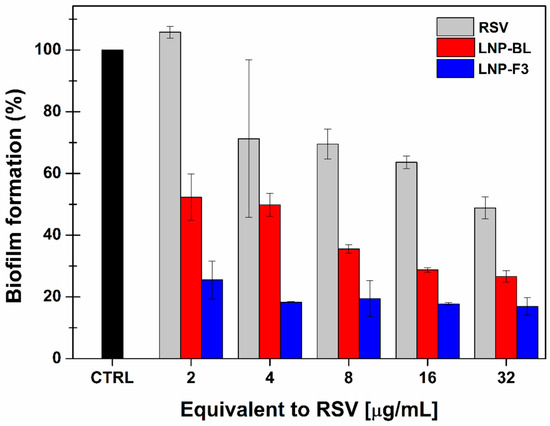 Biofilm formation % by S. aureus (ATCC 12973) after a 24 h treatment with free RSV solution (gray), LNP-BL (red) and LNP-F3 (blue) at increasing concentrations (equivalent to RSV 2, 4, 8, 16 and 32 µg/mL). The percentage of biofilm formation refers to the untreated control cells (black), considered as 100%. Mean ± SE (n = 3).