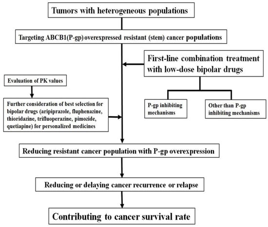 This review describes several bipolar drugs that have recently been shown to sensitize P-gp-overexpressing drug-resistant cancer cells. These drugs can be used as potential candidates for first-line combination treatments and repositioned at low doses. The drugs include aripiprazole, fluphenazine, thioridazine, trifluopherazine, pimozide, quetiapine, loxapine, and iloperidone [,,,,,,] (Table 1). Combination therapy with low-dose bipolar drugs is the focus of the discussion in the present review. Therefore, herein, we discuss combination therapies with low-dose bipolar drugs. This review can provide additional combination treatment options for these bipolar drugs as first-line combination treatments (Figure 1). In addition, we believe that this review will facilitate further clinical trials of P-gp-overexpressing drug-resistant cancer cells targeting drugs to kill small portions of CSCs or drug-resistant cancer populations.
