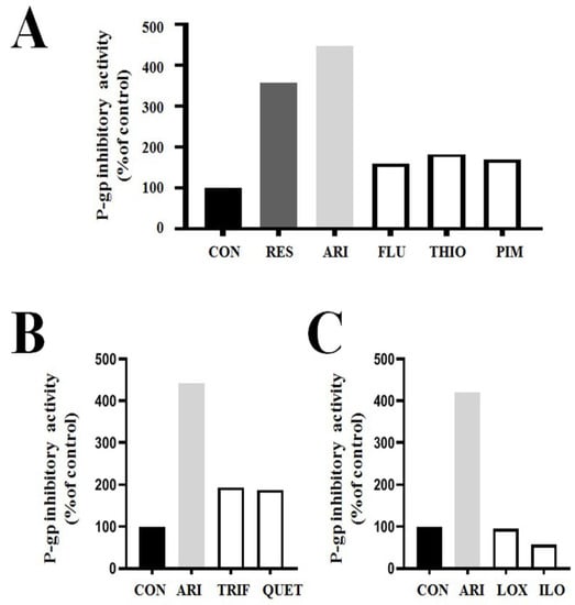 Moreover, a recent study demonstrated that aripiprazole had the lowest dose among 15 bipolar drugs for sensitizing antimitotic drugs-treated P-gp overexpressing resistant cancer cells [,]. Considering that low-dose aripiprazole has the strongest P-gp inhibitory activity among the 15 bipolar drugs compared (Table 1 and Figure 2A–C), the highest sensitization effect of aripiprazole resulted from its strong P-gp inhibitory activity in antimitotic drug-treated P-gp-overexpressing resistant cancer cells. Since reduced toxicities are proportional to low-dose drugs, aripiprazole is the most promising bipolar drug for a first-line combination treatment for resistant cancer populations. Considering that the strong P-gp inhibitory activity of low-dose aripiprazole has recently been demonstrated, intensive studies in both in vitro and in vivo animal models should be conducted for faster clinical trials.