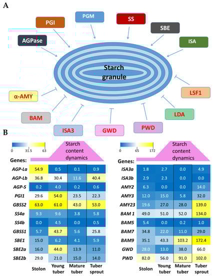- Van Harsselaar, J.K.; Lorenz, J.; Senning, M.; Sonnewald, U.; Sonnewald, S. Genome-wide analysis of starch; metabolism genes in potato (Solanum tuberosum L.). BMC Genom. 2017, 18, 37. [Google Scholar] [CrossRef]
