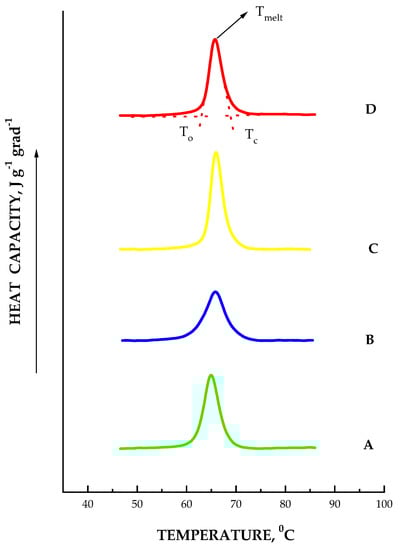 - Andreev, N.R.; Kalistratova, E.N.; Wasserman, L.A.; Yuryev, V.P. The influence of heating rate and annealing on the melting thermodynamic parameters of some cereal starches in excess water. Starch/Stärke 1999, 50, 422–429. [Google Scholar] [CrossRef]