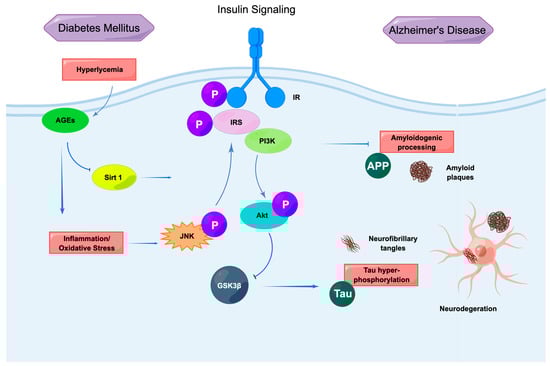 Insulin is a hormone that connects nutrients and metabolic homeostasis to systemic growth and development. Insulin is also regarded as an important participant in fertility and life span. In addition, this hormone also plays a major role in neuronal growth, connectivity, survival, and integral brain function. It has already been shown that AD and other neurodegenerative diseases are accompanied by peripheral and/or central insulin resistance. In AD pathology, elevated insulin levels can lead to extracellular regulatory kinase activation, which phosphorylates tau at Ser202, resulting in an increased number of neurofibrillary tangles [,]. Microtubules in the axons of neurons become unstable as a result. Insulin modifies Aβ intraneuronal concentration through the phosphoinositide 3-kinase (PI3K)/serine/threonine kinase (Akt, also known as protein kinase B or PKB)/glycogen synthase kinase 3 (GSK-3) pathway. Notably, insulin has anti-inflammatory properties as well []. Therefore, insulin can enhance emotions, behavior, cognition, learning, and memory capacities through its trophic and neuroprotective function in cerebral cells, protecting neurons from Aβ toxicity, oxidative stress, and apoptosis. Meanwhile, antidiabetic drugs are proven to have great potential in treating AD [].