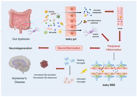 Emerging evidence regarding the function of the gut–brain axis and its influence on neurodegenerative disease has come from studies of the vagus nerve; this has been supported by an assessment of the incidence of dementia in patients with truncal vagotomy and concluding that vagotomy reduces the risk of developing dementia []. Not only does Aβ act as an initiator of neuroinflammation, but it has also been indicated that the peptide may be part of a response that is mounted by the innate immune system, which could mediate cytokine release and adaptive immune responses []. Intestinal inoculation with Aβ1-42 oligomers, and the subsequent spread of Aβ to the cholinergic neurons of the gut, cause dysfunction in specific gut regions; this ascends the vagus nerve to the brain, leading to cognitive deficits []. How Aβ spreads in the brain–gut axis and causes persistent dysfunction only in specific gut regions remains unknown. Notably, patients with AD have a lower ratio of Firmicutes to Bacteroidetes and a less diverse microbiome []. However, evaluations of the altered makeup of the gut microbiota have shown contradictory results in other AD investigations utilizing both humans and animals []. This discrepancy may be related to age, diet, and other factors. Additionally, changes in the gut microbiota and associated changes in the bacterial metabolism and metabolites may increase intestinal and BBB permeabilities. Short-chain fatty acids, SCFA, and other molecules derived from the gut microbiota accumulate in the brain due to increased permeabilities, causing inflammatory conditions in the microenvironment and laying the groundwork for the pathogenesis of neurodegenerative disorders such as Parkinson’s disease and AD []. Increased levels of the microbiota’s metabolites in the bloodstream, as well as humoral (such as pro-inflammatory cytokines) or cellular (like monocytes) effectors of peripheral immunity, may cause further pathogenic alterations. The function of microglia (brain-resident macrophages) and the imbalance of T-cells are influenced by the gut microbiota via the gut–brain axis [,]. For instance, SCFAs, a particular bacterial metabolite, influence glycemic regulation in various metabolic situations and are crucial to the metabolism of lipids and proteins []. The investigators found that SCFAs could promote microglial maturation, activation, and the generation of disease-associated microglia (DAM), a subset of central nervous system-resident macrophages found at sites of neurodegeneration; these may play a protective role in increasing plaque loads by helping to increase deposition and reduce clearance [,].
